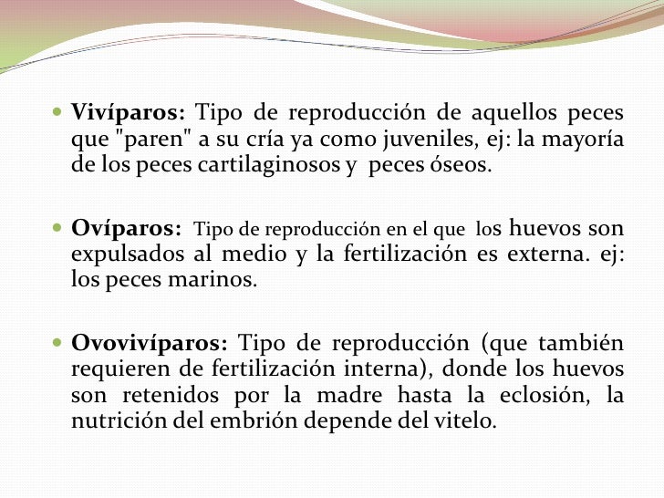 Ovíparos: Son los animales que ponen huevos y que se terminan desarrollando e el exterior alimentandose del huevo que lo contiene hasta su eclosión.